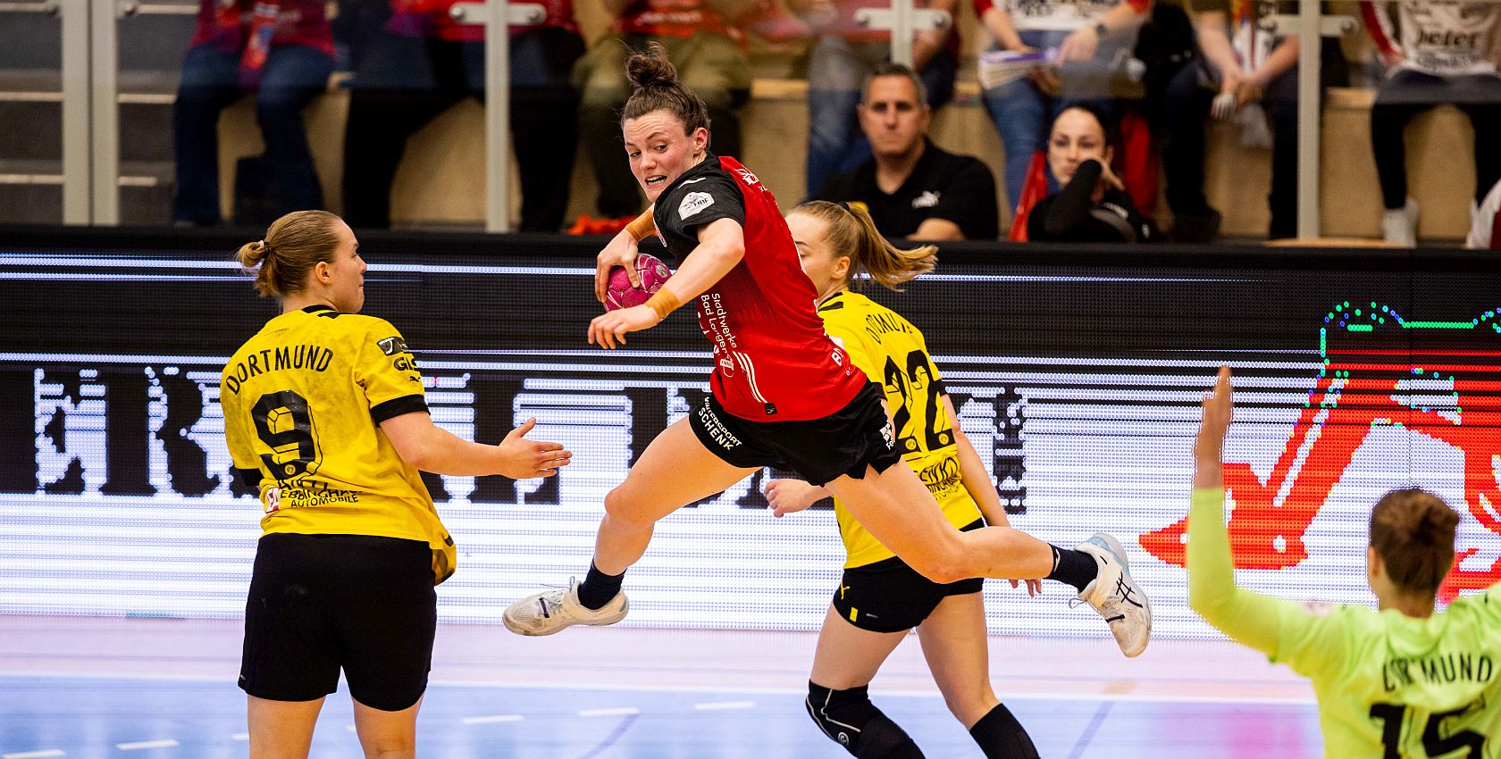 Der Thüringer HC startete mit dem Führungstreffer in die Partie. Zuvor parierte Nicole Roth, verschaffte sich so einen ersten Erfolg und steigerte sich über die gesamte Einsatzzeit. Die THC-Verteidigung störte früh die ballführende Dortmunderin, die trotzdem aus einer stabilen Abwehr heraus mit 1:3 in Führung gingen. Von Beginn an wurde sich nichts geschenkt, um jeden Ball wurde hart gekämpft. Dortmund legte vor, der THC lief zunächst hinterher. In der 9. Minute erzielte Johanna Stockschläder den 5:5-Ausgleich. Beide Teams bauten ihre Angriffe konzentriert auf, gingen aufs Tempo und suchten den schnellen Torerfolg. Die Führung zum 7:6 erzielte Sonja Frey nach 12. gespielten Minuten. Eine Minute später das Team Timeout durch Gästetrainer Henk Groener, der mit dem Tor zum 8:6 unzufrieden war und reagierte. Mit der Umstellung im Spielaufbau der Gäste und dem Einsatz von Alina Grijseels kam wieder gefährlicher Schwung ins Dortmunder Spiel. Der Thüringer HC verteidigte erfolgreich zunächst die Zweitoreführung. Mitte der ersten Spielhälfte stand ein 10:8 auf der Anzeigetafel. Der THC spielte, um den Druck zu erhöhen mit dem Empty Goal, brachte als Verstärkung und um die Überzahl im Angriff zu nutzen, die siebte Feldspielerin. Das zeigte Wirkung, in der 19. Spielminute erzielte Jaohanna Stockschläder das 14:9. Bei den Gästen stand inzwischen Madita Kohorst zwischen den Pfosten. Ein Wechsel, der sich an der Strafwurflinie positiv auswirkte, als sie gegen Nathalie Hendriks die Siegerin im direkten Duell blieb. Das Spiel beider Mannschaften wurde hektischer, Herbert Müller zog die grüne Karte und versuchte so Ruhe ins Spiel seiner Frauen zu bringen. Für den THC lief es nun besser, der Tabellenzweite baute die Führung zum 16:10 aus. BVB-Coach Henk Groener nahm knapp sieben Minuten vor der Pause die zweite Auszeit. Die Ansprache schien zu wirken, die Gästeabwehr stabilisierte sich, der Abstand bis zum Halbzeitpfiff auf drei Tore verkürzt – 18:15.