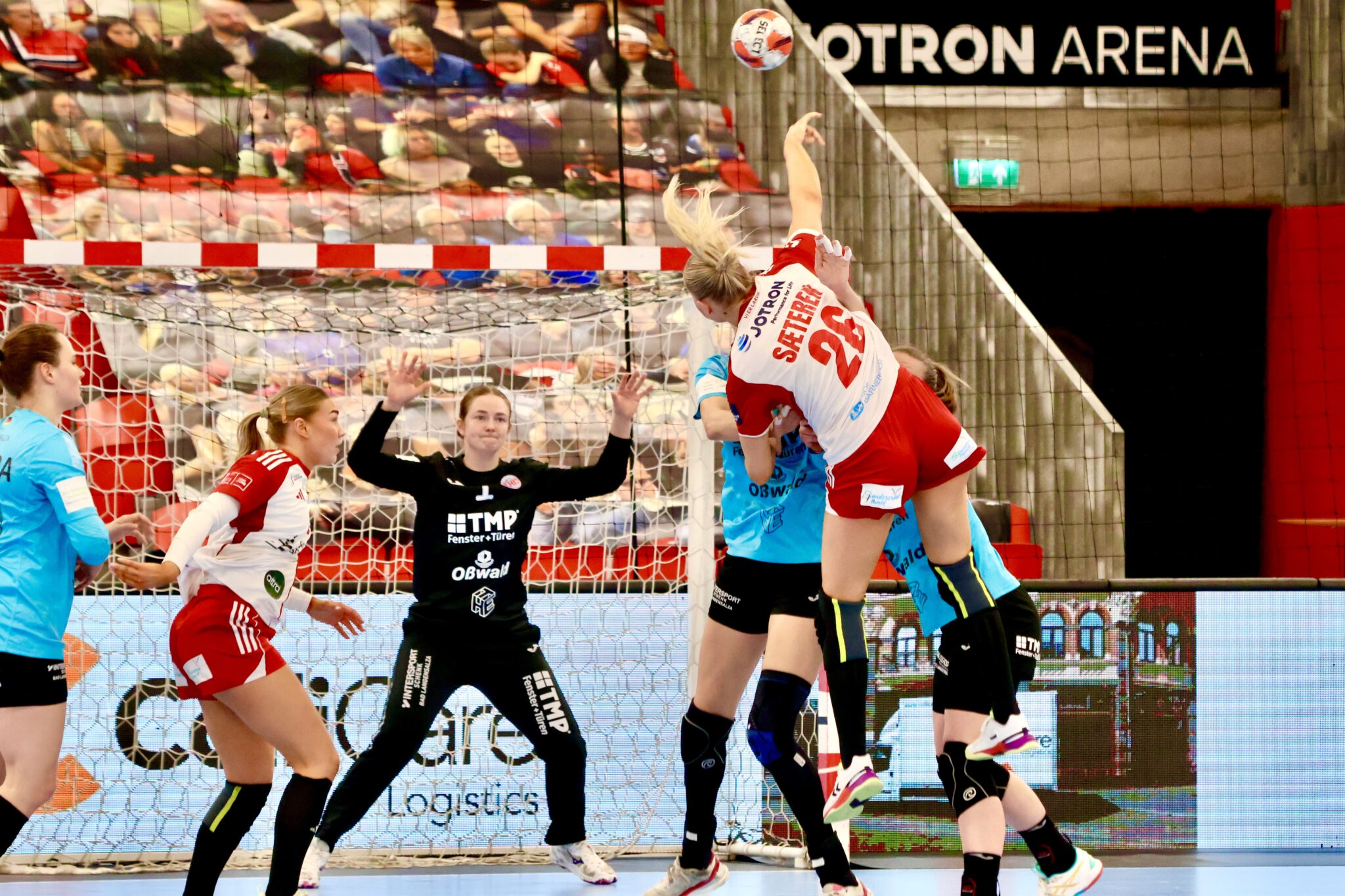 Die Partie begann mit viel Tempo, aber auch mit sichtbarer Nervosität auf beiden Seiten. Luca Farago erzielte den ersten Treffer, Jana Scheib legte nach, während Larvik erst in der dritten Minute erfolgreich war. Beide Teams leisteten sich einfache technische Fehler, Tempogegenstöße blieben ungenutzt und selbst vom Siebenmeterpunkt fehlte zunächst die Präzision. Larvik profitierte in dieser Phase von Unkonzentriertheiten der Thüringerinnen und ging mehrfach in Führung. Doch der THC hielt dagegen. Nach zehn Minuten stand es 5:5, das Spiel war offen. Johanna Reichert übernahm die Verantwortung im Rückraum, während Torhüterin Christina Lövgren Hallberg in Unterzahl mit wichtigen Paraden glänzte. Mitte der ersten Halbzeit fand der THC zunehmend zu seinem Rhythmus. Durch konzentrierte Abschlüsse und eine stabilere Abwehr setzte sich die Mannschaft von Trainer Herbert Müller zwischenzeitlich auf vier Tore ab (10:14). Besonders Lotta Heider setzte Akzente im Angriffsspiel. Doch Larvik reagierte, erhöhte das Tempo und nutzte die Thüringer Nachlässigkeiten konsequent aus. Vom Siebenmeterpunkt verkürzten die Gastgeberinnen und kämpften sich Tor um Tor heran. Kurz vor der Pause war die Partie wieder völlig offen – mit einem leistungsgerechten 17:17 ging es in die Kabinen.